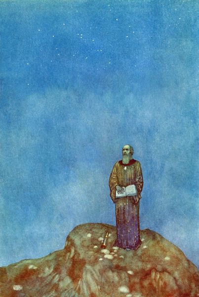 Edmund Dulac painted ‘Alone’ with watercolors in the early twentieth century. Note the solitary figure atop a peak, cape billowing, standing defiant against a sky filled with strange omens. This motif of the lone figure, battling the elements, echoes across art history. From Caspar David Friedrich’s ‘Wanderer above the Sea of Fog’ to countless Romantic heroes, we see man dwarfed by nature, yet determined. The cape here, however, takes on a life of its own, almost like wings, reminiscent of the Greek goddess Nike, symbolizing victory and aspiration. Consider how the clouds above echo the form of a dragon. Such mythical beasts are deeply ingrained in our collective subconscious, representing chaos and the unknown. The emotional power in ‘Alone’ lies in this tension between the individual's resolve and the overwhelming forces of fate. A powerful engagement with the viewer at a primal level. The symbol continues to resurface through time.