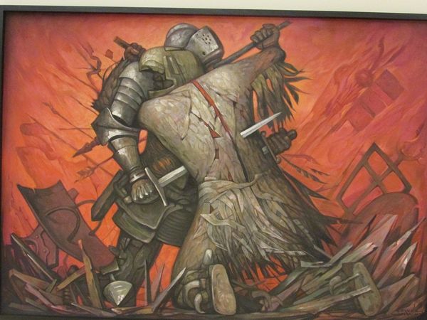 Józef Simmler made this oil study, "Figures of Armoured Guards," in preparation for his painting about Catherine Jagiellon's imprisonment. Here, Simmler focuses on the guards, using their imposing armor and solemn expressions to convey the weight of Catherine's confinement. Made in 19th-century Poland, then under foreign rule, this painting reflects a deep interest in national history and identity. The story of Catherine, a Polish princess imprisoned in Sweden, resonated with Polish audiences who were themselves living under political oppression. Historical paintings like this served as a form of cultural resistance, reminding viewers of Poland's past glory and struggles. To understand Simmler’s painting fully, historians delve into archives, studying letters, political documents, and even costume designs. This helps us grasp not only the artistic choices but also the social and political meanings embedded in the work. After all, art doesn't exist in a vacuum; it speaks to and is shaped by its time.