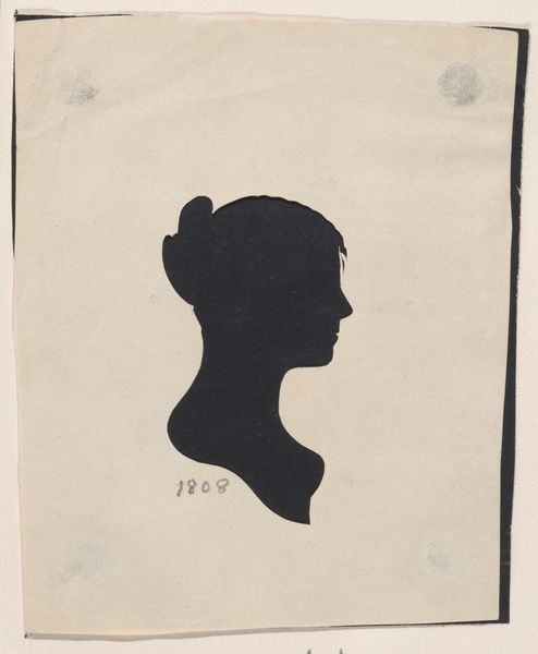 Curator: Let’s discuss "Silhouette of young woman, to right," a drawing and print on paper by William Chamberlain, made sometime between 1819 and 1829. Editor: My immediate impression is one of quietude. There’s something fragile and intimate about this small silhouette against the aged paper. It feels like a whisper from another era. Curator: The Romantic era, to be precise. The piece is very much of its time, don't you think? It presents a simplified form to amplify elegance. Note the precision in the line defining the profile, reduced to its absolute essence. Editor: I'm struck by that simplification as well. This form of portraiture was, in some ways, democratizing. But who got to have their image captured and preserved, even in shadow? How do we consider the absence of specific stories about women of color, lower classes, or other marginalized identities in similar archives of portraiture from this time? Curator: Precisely. In looking, we’re drawn to the play of positive and negative space, where the artist carefully balances the blank areas with the dense black. The silhouette is so pure as a formal exercise; the line becomes everything. And this piece uses line and tone so beautifully in relation to the physical characteristics of the female. Editor: The fact that it's a silhouette complicates interpretation. We're forced to project so much. Perhaps that's why I see it as inherently vulnerable, not simply elegant. Whose gaze was Chamberlain hoping to elicit? Is this woman merely a beautiful symbol, or does this profile represent an invitation to contemplate deeper social and personal realities? Curator: Excellent questions to bring to the forefront of interpretation. It is this sort of thinking that brings context and form together. Editor: Absolutely. I find that I appreciate the artistry all the more by keeping that consideration central to my engagement.