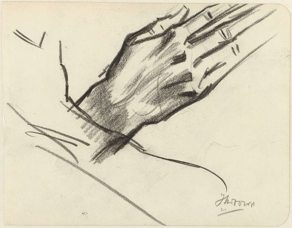 Editor: So this is "Twee handen," or "Two Hands," a pencil drawing from the late 19th or early 20th century by Bramine Hubrecht. It seems like a preliminary sketch, almost an exercise in capturing the hand's form. What do you see in this piece, particularly from a formal perspective? Curator: The drawing exhibits a fascinating exploration of line and form. The artist appears focused on understanding the anatomical structure of the hand, evident in the repetitive rendering. Note how the varying pressure of the pencil creates depth, suggesting volume through purely tonal shifts rather than reliance on contour. It's a study in the economy of means. How does the negative space around the hands influence your perception of the drawing? Editor: It makes them feel somewhat isolated, almost floating on the page, which further emphasizes the focus on pure form. The roughness of the lines, though, makes it seem more like a draft. Curator: Precisely. This rawness allows us to appreciate the artist's process. Observe how the hatch marks indicate the planes of the hand. The composition, with the hands arranged in a seemingly casual manner, reveals a deliberate intention to examine the subject from multiple angles. Editor: That's true. It's not just about one perfect representation, but rather about understanding the object through a series of studies. I was focused on what the hand represented, rather than just how the pencil worked here. Curator: Indeed, it reminds us that sometimes the most compelling aspect of art resides in its structure and composition, offering insights beyond mere representation. The lack of contextualization removes emotional elements. Editor: Right. I see how concentrating on these fundamental elements enables us to value the craftsmanship, even in what looks like a preliminary work.