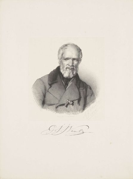 Curator: This drawing, crafted by Adrianus Johannes Ehnle in 1849, offers us a glimpse into the visage of G.J.J. van Os. You can find this compelling portrait hanging in the Rijksmuseum. Editor: Immediately, I'm struck by the texture. Look at the paper itself, and then the meticulous rendering of the coat, the way the graphite creates a tangible sense of wool. You can almost feel the weave. Curator: It certainly invites a tactile interpretation, and beyond the surface, note the details like the medal pinned to Van Os's lapel. Medals often symbolize honor, service, and civic virtue—key values in 19th-century Dutch society. We can see them representing status and dedication. Editor: But it is all graphite and paper, and that medal, so subtly suggested, holds immense social weight! I wonder, was the choice of drawing over paint one dictated by material access? Perhaps graphite made portraiture attainable for a different class, one for whom paint and canvas were financially out of reach? Curator: That's a fascinating suggestion. Indeed, drawing occupied a crucial position in this era. Before photography, it often served to record likenesses in a tangible and accessible way. Moreover, its immediacy lent a particular kind of intimacy to the result. Editor: Exactly. And look at the shading. Notice the strategic blurring around the edges; see how this choice minimizes the labor necessary to render the whole scene! Was it simply a matter of efficiency or indicative of the commercial concerns for these works? Curator: It makes me consider how these types of choices and visual signifiers became part of our cultural shorthand to understand each other then, as much as now. What a drawing could signal in terms of class, values and perhaps even aspirations. Editor: To see the image stripped of some layers of artifice, to be confronted directly with the hand of the maker. That alone is deeply engaging. I have a renewed appreciation of Ehnle's portrait and of what is being asked from that pencil as he draws this important figure of Dutch society. Curator: I wholeheartedly agree! Now I’m even more aware of Van Os as part of our evolving collective memory, his identity subtly influenced and defined by visual and artistic language.