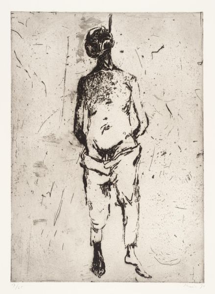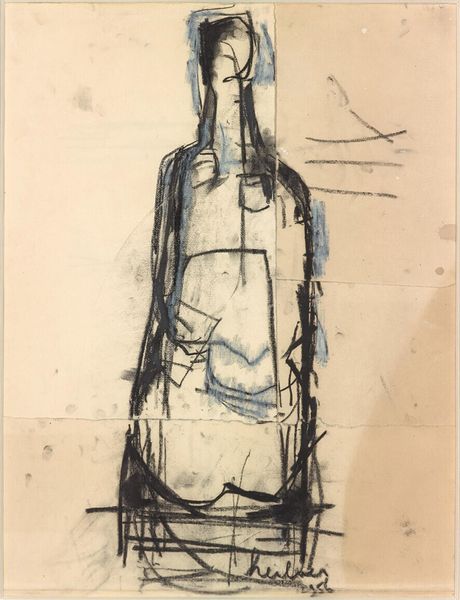 Curator: Before us is "Girl in Green Dress," a watercolor and drawing creation from around 1967 by Jiří Balcar. What do you make of it? Editor: I find this unsettling. The blacked-out head is so stark, almost violently anonymized. It gives an eerie, impersonal feel to what would otherwise be a simple portrait. Curator: That's a powerful observation. The facelessness is particularly striking, isn't it? It denies us the usual cues for empathy or connection. Balcar worked within a heavily politicized landscape. He used elements of surrealism and expressionism. Editor: I see that. And this is a portrait, a very old art form. I notice what appears to be letter-like markings at the bottom, these fragmented signs give an even stronger sense of alienation from traditional figuration. Curator: Exactly! These symbols disrupt any easy interpretation, forcing a break from traditional modes of seeing and understanding. Given the timeframe, we can consider the sociopolitical dimensions, perhaps exploring notions of conformity and individual suppression behind the Iron Curtain. The absence of a face acts as a powerful indictment against any single dominant view. Editor: And then there’s the green dress itself. The vertical rose stripe draws you to the head of the figure only to be pushed back by that darkness. I am reminded of old archetypes like Persephone in dark robes. There’s definitely a push and pull in the emotional content. Curator: Interesting parallel to Persephone. And it is so apt! Balcar used this ambivalence as a potent tool. It invites dialogue about power structures. What is acceptable versus unacceptable modes of existence. It subtly underscores how these dynamics shape and, in some ways, can negate our identities. Editor: I concur. The effect is haunting; something both distant and unnervingly present. Balcar captures this duality expertly through stark visual choices. It is the psychology of erasure being expressed through visual symbolism. Curator: Indeed, "Girl in Green Dress" challenges conventional ideas about portraiture. Its haunting anonymity is a testament to art's ability to address power dynamics with depth. Editor: Agreed; an unsettling yet revealing glimpse into the psyche through symbols, that encourages continuous engagement.