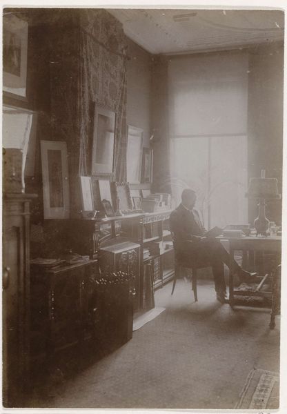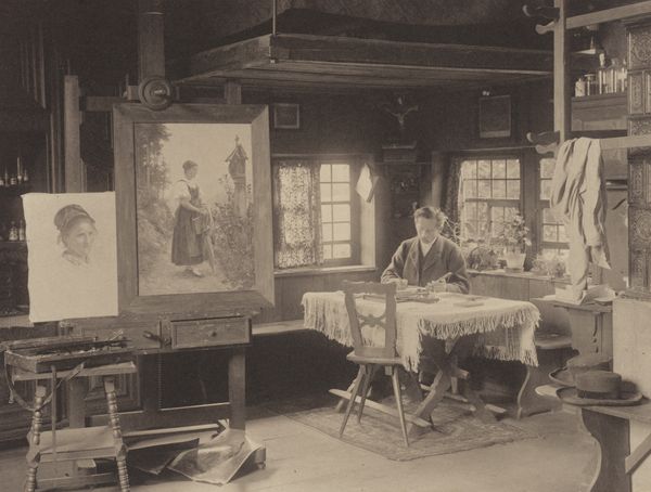 Curator: The stillness of this photograph, "Man in a Painter's Studio" by G. Hidderley, circa 1900-1910, draws me in. It feels like a moment caught in time, the quiet hum of artistic creation. Editor: My eye immediately goes to the artist's gaze. There's a strong air of confidence, even self-regard, which sits interestingly against the rather melancholy image he's painting. Curator: It’s compelling to consider the social context of artistic representation at the turn of the century. Photography's rise provided a new lens through which artists presented themselves and their work to the public, shaping their identity. Editor: And he certainly constructs a careful identity. The artist, surrounded by the tools and products of his craft, presents himself as a master, literally and figuratively framed by his own creation, the somewhat Van Gogh-esque image on the easel. Look how those colors in his palette seem subdued. It carries a feeling of introspective mood, of working in solitude. The slouching figure seems so isolated. Curator: This genre scene speaks to the period's focus on realism and academic artistic traditions, even within photography. The depiction of a studio, a place of labor and inspiration, becomes almost romanticized. Editor: The light and shadows are significant too. Notice how the artist is bathed in light while the subject of his painting seems shrouded in darkness, almost despair. This isn't merely a physical portrayal, it is imbued with emotional weight. Curator: Absolutely. The image serves not only as a portrait, but as an articulation of the artistic identity. By presenting his tools and paintings he invites the viewer into the rarified realm of the artist's workspace. It promotes the artist into a class of elite professional workers. Editor: Yes, this work feels deeply self-aware and invites many perspectives. Thanks to the light, composition, and subject choices we are able to gleam a window into this artists' mind and what imagery he's trying to create for his world. Curator: It makes you wonder about the image, as a historical document, and a constructed presentation of self and art. Editor: Precisely! And the powerful, yet intimate symbology invites layers of interpretation beyond what might seem immediately obvious.