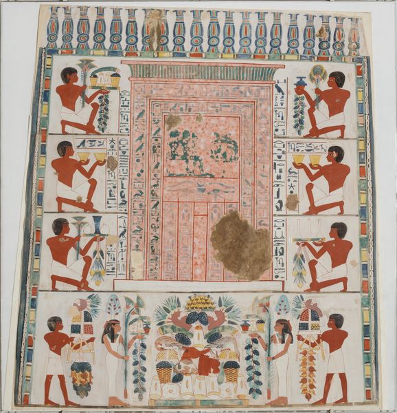 Editor: This is "Nakht and His Wife Receiving Offerings" from the Tomb of Nakht, dating back to 1390 BC. It's a mixed-media painting, and something about its stillness strikes me, like a moment frozen in time. What do you see in this piece? Curator: I see a convergence of symbols, each meticulously chosen to ensure Nakht’s prosperous afterlife. Note the repetitive, rhythmic presentation of offering bearers—what might that regularity convey? Editor: Abundance, maybe? And order? Curator: Precisely. Think of Egyptian art as a language where the placement, size, and even color of each element signifies something. The offerings themselves--food, drink--are not merely depictions; they're active agents meant to sustain Nakht's spirit. Consider also the positioning of Nakht and his wife: the shared seat, her arm around him... what does that suggest? Editor: Closeness, surely, but also maybe that they’re equals in some way? Or at least they’re unified in receiving these offerings? Curator: Exactly. Unity, shared status. Their pose is carefully constructed to portray not just marital affection but their intertwined destiny. Every image, every hieroglyph whispers of eternity, continuity, and the enduring power of symbolic representation. It's a carefully orchestrated narrative aimed to transcend time itself. Editor: So, reading the image isn't just about aesthetics; it's about decoding a cultural script. Curator: Absolutely! It reveals how much images carried weight, reflecting hopes, beliefs, and the eternal human desire to leave a mark. Editor: That’s fascinating, I didn't consider how purposeful each visual choice was. It gives the image so much more depth.