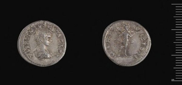 Curator: Here we have a silver denarius, issued during the reign of Septimius Severus. It's a tiny thing, but it speaks volumes about power and legacy, wouldn’t you say? Editor: Absolutely, there is something melancholy about the figure; though confident in stance, it hints at something forlorn. It's also incredible to think of all the hands this has passed through. Curator: The Emperor's portrait, rendered in profile, has a sort of austere beauty. These coins functioned as propaganda. Editor: Exactly, the imagery on coins became powerful tools. Each symbol was loaded with meaning—it was a way to imprint authority and communicate ideas about the empire. Curator: Funny, to think such a small object carried so much weight, both literally in silver and figuratively in its message. Editor: Precisely. It's like holding a whispered secret, a tiny echo of grand narratives and personal stories. A poignant reminder that empires crumble and fade, but symbols often remain.