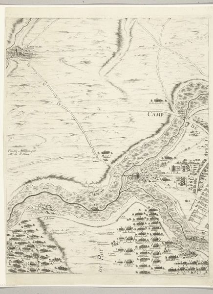 Curator: Here we have William Hogarth’s "Parke of the Artillary," an engraving with pen and ink created circa 1724. Editor: It’s quite detailed, almost like an architectural plan or a technical drawing. I'm curious, what visual elements stand out to you most in this print? Curator: Immediately, the intricacy of the linework compels my attention. Consider how the varying densities of the hatched lines construct a sense of spatial depth and material texture, especially the way Hogarth indicates the topographical features. The visual rhythm, achieved through the repetition of certain graphic motifs, also is intriguing. Editor: Are you referring to how he rendered the troops or landscape? Curator: Indeed, though, on closer inspection, it is clear Hogarth emphasizes formal harmony rather than absolute topographical accuracy. Take note, also, of how he organizes the textual elements—the lettering becomes integral to the composition, shaping its very form. It functions less as pure information and more as structured elements on the picture plane. Editor: I see what you mean, the text blends in as much as it describes. So you’re not so concerned with what's *being* depicted, but rather *how* it is depicted, that Hogarth is focusing on form over function. Curator: Precisely. The aesthetic relationship established by the composition supercedes any representational imperative. Do you agree? Editor: It hadn't struck me at first, but I am persuaded by the argument about form and line in rendering depth and drawing our attention. Thanks, this deeper focus enhances my understanding. Curator: A worthwhile discussion. I find the visual vocabulary deployed here truly remarkable.