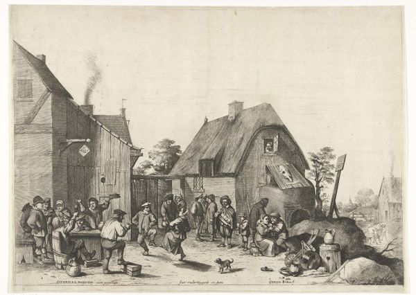 Editor: This is Joseph Collyer's "Dutch Pastime". It looks like an etching or engraving, and there is such a sense of lively chaos in the composition. What do you see in this piece that perhaps I’m missing? Curator: Beyond the festive surface, I see a critical depiction of social dynamics. The boisterous scene, with its revelry and implied intoxication, serves as a commentary on societal norms and perhaps the artist's view of Dutch culture in the 18th century. Do you think the artist is celebrating or critiquing this "pastime?" Editor: I hadn't considered it as a critique, but the sheer disorder does make me wonder. Curator: Precisely. Consider who is actively participating versus who is observing. This division highlights power structures and social exclusion, prompting us to question whose "pastime" is truly being represented and at whose expense. Editor: That’s a perspective shift for me, thinking about art as social commentary. Curator: Art can be a mirror reflecting societal truths, even uncomfortable ones. Always question what the artist includes and what they omit.