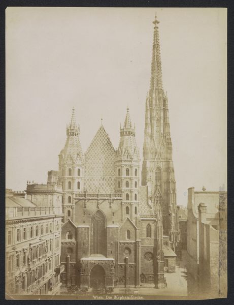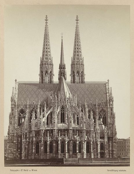 This is A. Wimmer's photograph of the Votivkirche in Vienna. Its sepia tones and material texture give it a unique, ethereal quality. The building’s facade is meticulously detailed with spires reaching towards the sky, drawing the eye upwards. The photograph uses architectural elements to explore themes of power, faith, and human aspiration. The soaring vertical lines and intricate Gothic details reflect a desire to reach beyond the earthly realm, engaging with the sublime. The Votivkirche’s imposing structure, captured in the photograph, becomes a signifier of cultural and religious dominance. The careful composition, which emphasizes the church’s height and complexity, suggests a reading of the architecture as a form of visual rhetoric. Ultimately, this photograph prompts us to reflect on how architecture is used not just functionally but also ideologically. It invites us to consider how the arrangement of space and form can communicate values, beliefs, and power structures within a society. This image remains open to interpretation, inviting ongoing dialogue about the intersection of art, architecture, and culture.