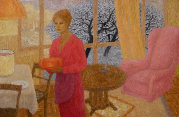 Curator: Let's spend a few moments reflecting on this oil painting titled, "Mowing Grass in Africa," by Iwo Zaniewski. It’s a compelling tableau. What springs to mind for you, Editor? Editor: Oh, my first thought is melancholy. It's strangely subdued for such a potentially vibrant scene, with the woman holding what appears to be a pot, her face in shadow. And this rather odd scene of mowing grass viewed through the doorway is somewhat disorienting. Curator: Disorienting, indeed. We are drawn to that liminal space between indoors and outdoors. Zaniewski, here, seems to be investigating themes of domesticity and labor through a cultural lens. Notice how the very act of “mowing grass”—something banal to one culture, is made intriguing when juxtaposed with the "Africa" in the title? What associations does that draw for you? Editor: Well, instantly, there is the visual dissonance. Is that "Africa" we’re seeing, I wonder? It has all the hallmarks of American suburbia. A man, dutifully maintaining an almost aggressively perfect lawn that frankly looks like it would need a riding mower instead of manual. Then this woman inside. Her cultural or emotional remove almost echoes how foreign I feel trying to connect all the painting's suggestions together. Curator: It does feel that way. But there's possibly also an echo of tradition versus modernity here. The manual lawnmower itself evokes a different era. Then the way that Zaniewski has staged the scene through a frame suggests the enduring presence of cultural practices even amidst modernity. There is an engagement with labor as a constant across human experiences but colored so uniquely through differing social experiences. Editor: True, it all feels very intentionally posed. The lamp inside, for example. You know that’s not just an accessory, it feels weighted with suggestion. All that filtered light; it almost speaks of memory, distance and nostalgia. All under that rather unsettling, greyish sky... I just want to burst into that picture with a bunch of brightly colored beach umbrellas! Curator: A powerful, almost genre-bending synthesis by Zaniewski, challenging us to bridge seemingly disparate realities through symbolism. I will consider its meaning for a long time to come, that's for sure. Editor: Absolutely. And to think, it all started with a man and a lawnmower. Who knew!