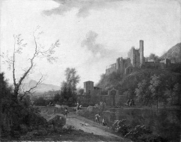 Editor: Okay, here we have Jenaro Pérez Villaamil's "Castillo De Alcalá De Guadaira", rendered with oil on, presumably, canvas. There's a... dreaminess to the scene. Almost like a theatrical backdrop. What do you make of it? Curator: Well, it strikes me as one of those paintings that hums with a yearning for a bygone era, you know? A bit of stagecraft indeed! Think of the Romantics, how they lapped up history and legend like honey. Do you get a sense of how Villaamil has balanced the sheer solidity of the castle with that almost ethereal light? It's not just documenting a castle; it’s inventing a mood. Editor: Absolutely, the light is almost… supernatural. Was he consciously playing with realism versus idealism, you think? Curator: Good question. He's certainly bending reality! The meticulous detail in the figures and foreground contrasts so vividly with the hazy castle on the hill. Almost like memory, sharply focused here and dreamlike over there. I wonder, does the painting spark anything within *you*? Editor: Hmm… nostalgia maybe? A longing for something grand and a little lost in time. The ordinary people going about their lives in front of this monumental architecture... there's a compelling juxtaposition there. Curator: Precisely! And isn't that the bittersweet charm of Romanticism? Big ideas and crumbling stones. It’s like a beautifully melancholic postcard from the past, reminding us of fleeting glory. Editor: I never really thought about the melancholy aspect quite that deeply, actually. Thanks, this has helped so much! Curator: My pleasure! Art’s a conversation, isn’t it? Between the canvas and the soul, between history and the heart. Glad it stirred something in you.