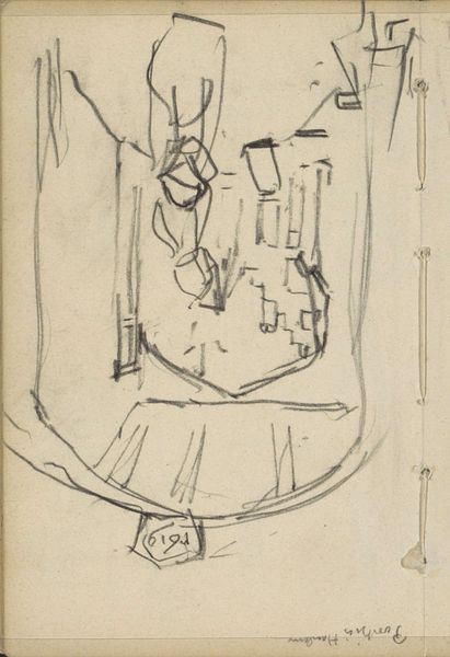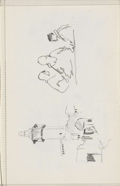 Curator: This intimate pencil sketch by John Singer Sargent is titled "Rimmonim with Bells; verso: Partial Sketch of a Wing," and it resides at the Harvard Art Museums. It's about 12 by 10 centimeters. Editor: It has a fragile, almost ethereal quality. The quick lines suggest a fleeting moment captured. I wonder about the paper itself; was it easily accessible? Curator: Rimmonim, traditionally adorning Torah scrolls, symbolize the beauty and sanctity of religious texts. Bells often accompany them, creating a joyful sound during processions. The wing sketch on the back suggests Sargent's broader artistic interests. Editor: It's fascinating how Sargent, known for his society portraits, turns his attention to ritual objects. The sketch reveals the labor of observing and translating form. Was this a study for a larger work, or simply a moment of personal exploration? Curator: Perhaps it was a glimpse into Sargent's own spiritual or cultural reflections. The symbols resonate deeply within Jewish tradition, representing reverence and celebration. Editor: Indeed. And thinking of the materials—pencil on paper—it underscores the accessibility of art-making, the capacity to find inspiration in everyday life. It feels raw and immediate. Curator: I agree; it offers a more vulnerable insight into the artist's process. Editor: Absolutely, a tiny sketch can hold profound resonance.