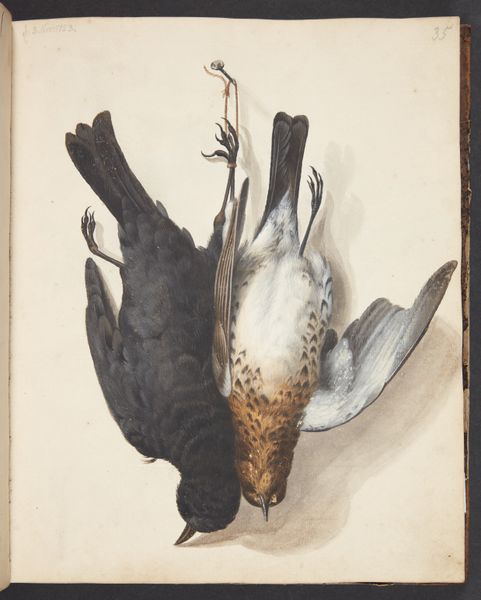 Count Giorgio Duranti rendered "Two Dead Ducks" using pen and watercolor sometime in the 18th century. The image depicts two lifeless ducks, an arrangement that transcends mere representation, becoming a symbolic tableau of mortality. Consider the duck, historically a symbol of transition, journeying between water, earth, and air. Here, though, they are stilled. This juxtaposition reflects back to ancient Roman funerary art, where fowl were carved into sarcophagi, representing the soul's journey to the afterlife. Yet, Duranti presents them in a stark, unadorned manner, stripped of mythological or religious context. This very lack becomes a powerful statement. The presentation of dead animals also recalls the "memento mori" tradition. Like a skull on a scholar's desk, they serve as stark reminders of life's fleeting nature. The ducks, once vibrant creatures, now hang limply, their stillness resonating with the quiet inevitability of our own mortality. This image taps into our collective subconscious, provoking a visceral awareness of the transient nature of existence.
