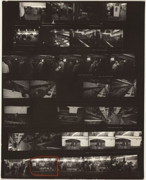This contact sheet was made by Robert Frank, showing the premiere of "Helen of Troy" in Los Angeles. It’s like a storyboard, but more raw, less polished. The high contrast, the way the light bleeds into the dark, that’s Frank’s signature. It’s all about the process; the grain is the texture here. There’s a kind of frantic energy, a voyeuristic feel. The red lines scratched across it, it's an interesting addition of a mark. Look at how the faces emerge from the gloom, or just dissolve into it. It’s this back-and-forth between presence and absence that really gets me. Like de Kooning and his women, these images are there and then not there. The sequence feels related to the work of someone like Duane Michals, especially his narrative sequences. The real story here is not Helen, but the mystery of what we see, and how we see it.