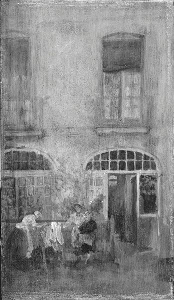 Curator: This is William Logsdail’s "A Corner of Old Venice," painted in 1885. You can see Logsdail’s exploration of both realism and impressionism. Editor: Immediately I notice the somewhat muted tones and the play of light and shadow on the weathered stone—there's a melancholy atmosphere clinging to it, don’t you think? Curator: Indeed. Considering its date, it’s intriguing to observe Logsdail’s blending of techniques. Notice the visible brushstrokes; oil paint is applied rather loosely. Editor: And what of the woman near the canal? I am drawn to the marginalized figure, rendered anonymous within a decaying yet picturesque locale. One must consider the socio-economic context. Who was she? What labour was she engaged in? Venice, after all, has never just been about romance. Curator: Absolutely. It's relevant that the work was completed towards the tail end of the Long Depression and mass industrialisation, but I suggest we appreciate the artist’s handling of texture and the subtle depiction of daily labour alongside those romanticized buildings, the juxtaposition heightens its realism. Editor: Yes, a vital counterpoint! Think too, though, about the prevailing power structures which shaped urban existence and working life then. Those beautiful buildings were made by the hands of people who are hardly mentioned in art historical surveys. Curator: The surface complexity is what I am focusing on though; its layering suggesting the real weight of historical creation but using modern techniques to represent it, which shouldn’t be downplayed. Editor: Perhaps by considering her anonymity and placement we are also looking at an era’s limited roles for women in the art world and, in some ways, also how limited the male perspective could be? It really triggers you to consider Venice at a nexus of power, poverty, and representation. Curator: Certainly. In sum, the layers of paint contribute to the material weight that enhances our appreciation of 19th-century cityscape construction. Editor: A necessary, nuanced consideration of Venice’s beauty but, yes, absolutely more layers. Thanks for that.
