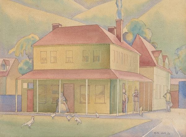 Gladys Cook created "The Bowery House" using watercolor. The composition is structured around a central house, flanked by trees and greenery, all rendered in soft, muted colors that create a serene and inviting atmosphere. The formal arrangement suggests a careful balance between nature and architecture, where the house is not just placed within the landscape but integrated into it. The use of watercolor allows for gentle gradations and transparencies, softening the edges and blending forms, emphasizing the harmony between the man-made structure and the natural elements. This blending destabilizes the strict boundaries between constructed and organic forms, hinting at a co-existence. The composition invites us to consider how structures, both physical and conceptual, define our perception and interaction with the environment. Cook prompts us to reflect on how we negotiate and blur the lines between what is built and what grows.