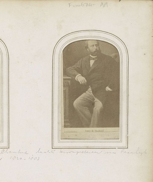 Editor: We're looking at a photograph, likely taken sometime between 1870 and 1880. The title identifies the subject as Hendrik van Artois Bourbon, the Count of Chambord, who was also a French pretender to the throne. It's a rather formal portrait. What stands out to you in this image? Curator: The image speaks volumes about the visual construction of power. Consider the careful cultivation of the Count’s beard and the set of his bow tie. These elements communicate authority, rooted in tradition. We're not merely looking at a man, but at a carefully crafted symbol of a lost monarchy. Do you see any irony in employing the relatively new medium of photography to assert such an old claim to power? Editor: That's an interesting point. It feels a bit like trying to use modern tools to revive a past era. It makes me think about how the image attempts to freeze him in time, or rather, in a specific ideal of time. Curator: Precisely. Think about how portraiture has been used throughout history to solidify legacy. This image evokes that tradition, and it uses those symbols to imply legitimacy, and project an aura. Now consider how the choice of sepia tones further distances him from the present, imbuing the image with a sense of timelessness and a golden age that, arguably, never existed. What emotions do these artistic choices evoke in you as the viewer? Editor: A sense of nostalgia, definitely. It almost feels like viewing a relic, a fragment of a dream that was never fully realized. Curator: And that's the crux of its power. Photography here transcends mere representation and acts as an icon, loaded with historical longing and the potent symbolism of a bygone era. This stirs something deep within our collective consciousness, a testament to the enduring strength of visual symbolism. Editor: I hadn't considered the photograph itself as a symbolic object, but your points really highlight how images can function on multiple levels, conveying both explicit and implicit meanings. It gives a whole new appreciation for portraiture. Curator: Indeed. It reveals the carefully constructed performance of power, forever preserved in this photographic moment.