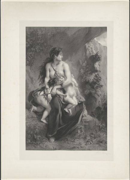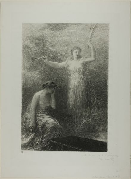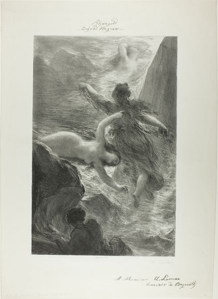 Editor: This is Henri Fantin-Latour's "Finale to the Twilight of the Gods," a lithograph from 1892. The swirling lines give it a dreamy, almost melancholic feel. What do you see in this piece? Curator: Beyond the surface, I see a commentary on power, gender, and representation rooted in Wagnerian opera. Consider the female figures: How are they positioned in relation to the ‘gods’ and the overall narrative of destruction? Fantin-Latour, a man of his time, engages with complex ideas about femininity, agency, and societal collapse. What’s striking is the visual language. Do you see how he uses light and shadow? Editor: Yes, there's a real contrast. The figures are highlighted, but the background seems darker, almost ominous. Is he critiquing the traditional heroic narratives, perhaps? Curator: Precisely! Think about the title itself - "Twilight of the Gods." The piece asks, What happens when the established power structures crumble? And who is left to bear witness? The female figures, in their varied poses, become central to this question, suggesting alternative readings of heroism and resilience in the face of destruction. How do their bodies tell a story of power? Editor: I guess I hadn’t thought about the female figures as being central, but I see what you mean. They are the ones surviving, or at least witnessing, this 'finale'. I thought this was only a Romantic landscape. Curator: Landscapes are rarely neutral. Considering the historical context, late 19th-century anxieties about modernity, the rise of feminism, and shifting class structures become subtly woven into the artwork, disrupting simplistic interpretations. The landscape and the figures aren't just pretty; they're politically charged. Editor: This really gives me a lot to think about. I never realized the depths to which social issues could be embedded in a piece like this. Curator: Absolutely, and understanding those layers is essential to responsible art historical engagement. We bring historical pieces into conversation with contemporary concerns.