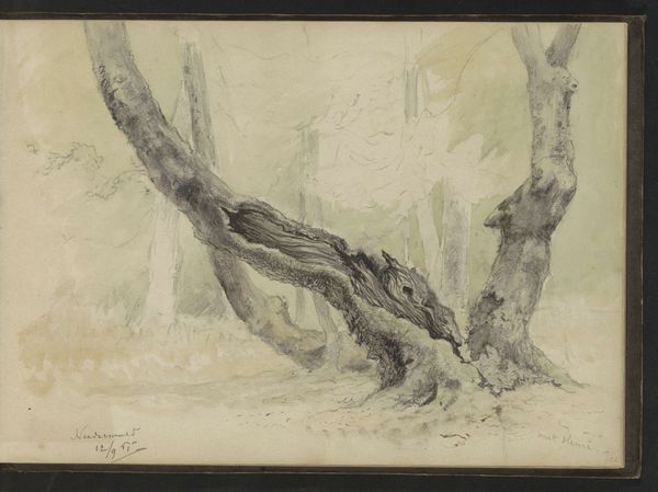 Curator: Looking at Maria Vos’s "Bomen begrensd door een hek op landgoed Hoog Oorsprong," dating from around 1864 to 1865 and held at the Rijksmuseum, one is struck by the soft washes and the delicate interplay of light and shadow. Editor: Yes, there's a subdued, almost melancholic quality to the piece. The composition seems carefully orchestrated, the way the trees frame the distant field. I can almost smell the damp earth. Curator: Vos, often associated with Romanticism, used plein-air techniques which speaks to the labor involved, working directly from nature. The application of watercolor here, the control, signifies a skilled craftsperson mastering the medium. Editor: Precisely. Hoog Oorsprong was, I believe, a significant estate near Oosterbeek. Images such as these were instrumental in constructing ideas around landscape ownership and national identity within Dutch society. Consider also how landscapes in this era reinforced bourgeois values through ownership and display. Curator: Absolutely. And how the fence itself acts as both a visual barrier and a material representation of ownership, dividing nature from cultivated land, wild from tame, raw materials for the use of the Dutch economy. Editor: And the romantic sensibility prevalent at the time also encouraged a fascination with, and perhaps an idealization of, rural life, offering an escape from rapid industrialization and its social tensions for those who owned estates. Curator: Vos' choice to depict the trees in such a prominent manner, partially obscuring the view, perhaps is questioning or softening this perception, highlighting the power and persistence of nature itself. Editor: The very act of a female artist engaging with plein air painting during this time also carries social significance. While often perceived as a harmless pastime, artistic creation can act as an opening within these societal structures and offer insights that critique its established customs. Curator: Indeed, exploring that relationship is what makes this work compelling even now. Editor: Agreed, considering these layered influences deepens the understanding and value of this piece.