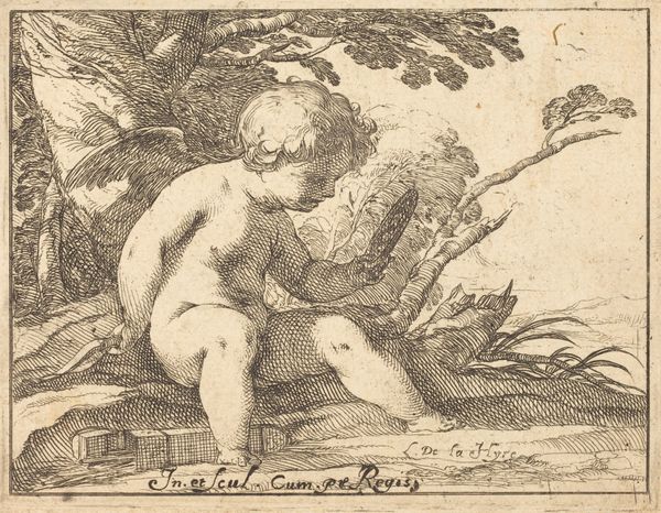 Curator: This engraving, "The Christ Child Sleeping on a Cross in a Landscape, crown of thorns in the foreground, after Reni" dates back to 1765-1780, a product of Gaetano Gandolfi's artistry. It resides here at The Met. Editor: My immediate impression is one of serene melancholy. The juxtaposition of the sleeping child and the stark symbols of crucifixion creates a very potent emotional field. Curator: Gandolfi was, in essence, reproducing a work by Guido Reni. He acted as an engraver reproducing paintings and Gandolfi shows real technical skill here in translating the painting into a series of very economic lines that make up the engraving. One of the interesting production challenges would be the transfer of Reni’s image from the canvas to the copperplate medium that Gandolfi works upon to create this print. Editor: The crown of thorns at the foot of the cross…that's heavy stuff. Even in slumber, there's no escape from what is coming for him. That landscape, so placid, seems almost complicit in its silence. The dreamlike haze reminds us of a certain melancholy of Renaissance paintings, an understanding of tragedy, an acknowledgement of sadness, a subtle recognition of impending mortality. Curator: We need to consider printmaking's role, which made images and ideas accessible to a broad audience in this era, allowing wider distribution for devotion but also affecting workshops, as we see collaboration between painters like Reni and printmakers like Gandolfi shaping artistic production and networks. The Baroque’s high drama met efficient image production, feeding the devotional needs and taste for art reproductions during that time. Editor: And how different this is to what you describe. Consider how that innocent nakedness transforms under this symbolic weight. The open-shuttered eyes closed. This work captures innocence yoked to destiny, love paired to sacrifice, foreshadowing imminent loss; I find it quietly overwhelming. Curator: It really gets to something central in terms of the accessibility afforded by printed material and labor of love and work for all concerned during this period. Editor: Indeed, something enduringly poignant. Thank you.