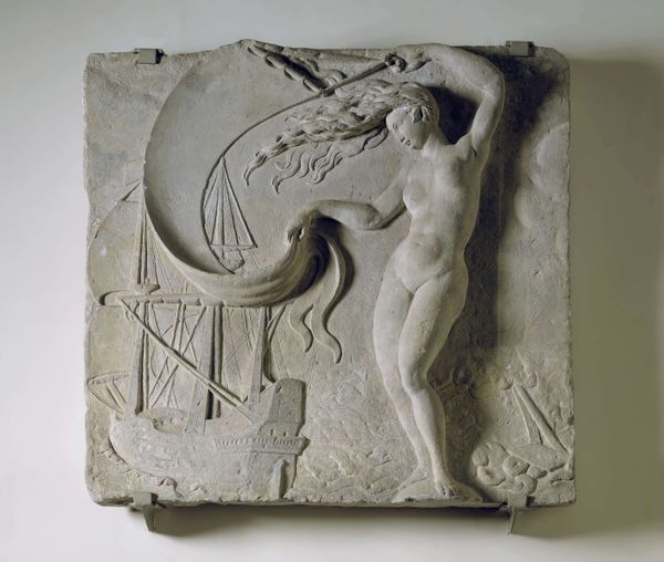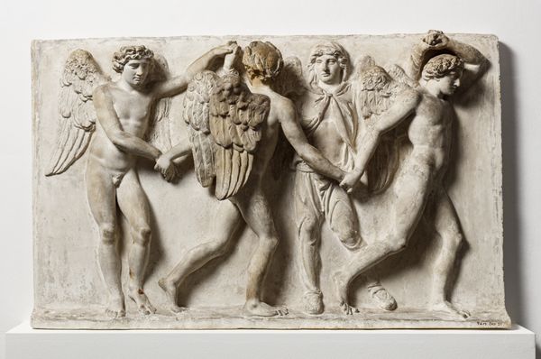 Editor: So, here we have a marble sculpture titled "Achilles about to kill Hector, Pallas Athena between them," created by Giovanni Maria Benzoni in the 19th century. It's imposing, this standoff, very classically charged. What captures your attention most when you look at this scene? Curator: Oh, darling, the dance of hubris and humanity, rendered in stone! Isn't it a riot? Look at Achilles, so pumped up, all wrath and bared chest. Hector, bless his soul, knows his goose is cooked, doesn't he? But it’s Athena playing referee that truly tickles me. Is she preventing or encouraging? Editor: I always assumed she was trying to restore some kind of balance or offer protection. Curator: Perhaps, but Gods and Goddesses are mischievous like that! Did the artist capture something more, perhaps her own conflicted allegiances? The 19th century had such a flair for these theatrical moments. This whole neoclassical vibe can feel so…stagey. So sculpted, and a very romanticized war story that perhaps leaves the true feeling in a cloud of dust. Editor: I see what you mean. I get so caught up in the dramatic poses I sometimes miss the possible…ambiguity? Curator: Exactly! And isn't that where the real intrigue lies? Forget the biceps and spear thrusts. Think about what is behind it all. How do we feel in these positions? Editor: That really reframes the whole piece. Thanks! Curator: My pleasure! Remember, darlings, art isn’t just about *what* you see, but *how* it makes you feel and maybe even a wry giggle.