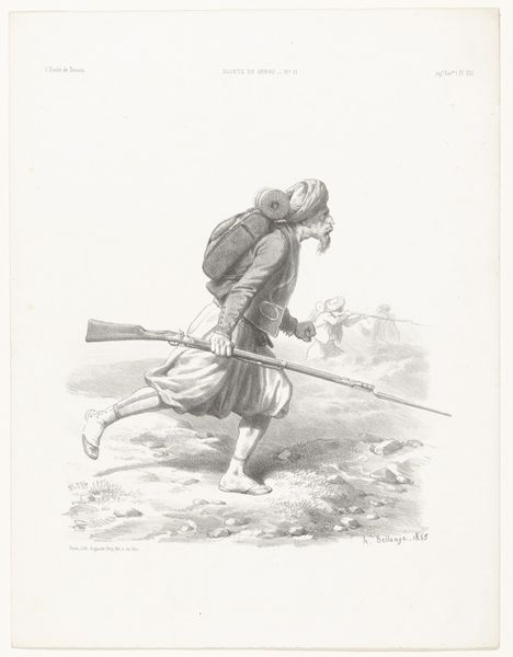 This is "Lunging Soldier Seen from Behind," a drawing by Matthias Pfenninger, made sometime in the late 18th or early 19th century. The composition is dominated by the figure of a soldier, captured mid-lunge, with dynamic lines that convey a sense of force. The artist has used hatching and cross-hatching to sculpt the form, giving volume to the soldier's muscles and clothing. Note how the figure’s body is contorted to suggest motion, with one foot firmly planted on a jagged rock and the upper body straining forward. The visual structure here prompts us to think about the formal conventions of representing human anatomy and movement. The soldier is presented from an unconventional angle, inviting us to consider not just the physical but also the psychological dimensions of conflict. This artwork uses its formal elements to explore themes of tension, action, and the individual within the chaos of battle. The soldier's posture and the rugged landscape combine to create a narrative about resilience and struggle. This artwork does not offer fixed answers but rather invites ongoing interpretation.