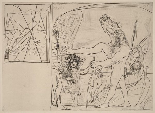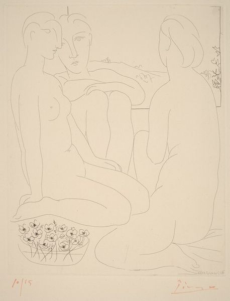 Pablo Picasso made this etching, Variation on Delacroix's 'Women of Algiers': IV, at some point in his career, using a metal plate and acid to bite these lines into the surface. Look at how spare these lines are, like he is trying to find his way into a new space, by interrogating an older one. There is something very special about the graphic nature of etching. The stark contrast between the white of the paper and the black of the ink puts you right in touch with the artist's hand. Notice the figure on the bottom right, with her legs akimbo. The lines are so simple, so clear, and yet they perfectly describe the weight and volume of her body. That simple figure reminds me of Matisse, a little, and of course it reminds me of Delacroix, but really it reminds me that art is a conversation between artists, constantly quoting and riffing on each other's ideas. Picasso is never afraid to make a statement, and in this piece, he is practically shouting.