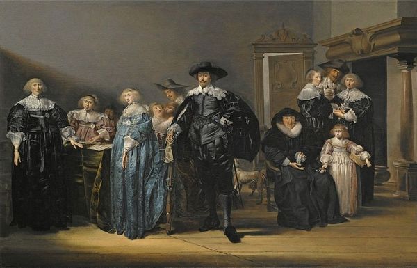 Editor: "An Elegant Company," crafted with oil on canvas in 1632 by Pieter Codde. At first glance, I'm struck by the theatrical quality. It feels like we've stumbled into a scene mid-performance. The muted tones and intimate setting add to that impression, and almost gives me the impression of stepping into a tavern in the 17th century. What do you see when you look at it? Curator: You know, that theatrical sense really resonates with me, as well. It's like a little drama unfolding, and Codde has captured a fleeting moment. Think about it: the Baroque period was all about grand gestures, heightened emotion. It wasn’t unusual for painters to blend realism and staged narrative into one. Doesn’t this painting remind you, just a little bit, of going to the theatre or even a masked ball? What are some details you noticed about what those depicted are wearing? Editor: Well, those wide collars are hard to miss. Also, all the different shapes of the hats they chose... I feel underdressed even just looking at it. Curator: Indeed! And all that fine clothing underscores the wealth of those represented. They look, well, fancy. But more than just clothes, those extravagant details, almost whimsical, capture that buoyant feeling so present in 17th-century Netherlands. The rise of merchant society allowed artists like Codde to display a lifestyle that wasn’t purely somber – think about other Dutch Golden Age paintings, sometimes called "tronies" -- they're filled with character, joy, but in a deeply thoughtful way. What do you think is the relationship between what they are wearing and their feelings and thoughts? Editor: That's fascinating! I hadn’t thought about the clothes as directly connected with their expressions of happiness. Seeing them now more closely, all those details certainly enhance the festive atmosphere of the whole artwork. Thank you, that brought up lots of new perspectives. Curator: Oh, my pleasure. Sometimes a change of clothes can feel just like getting a new lease of life, I can understand them! It also helps put the art and our modern feelings closer together, after so many years apart.