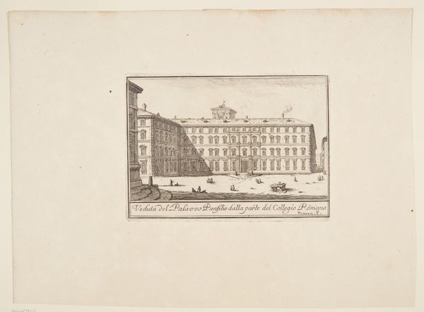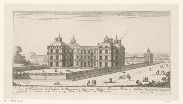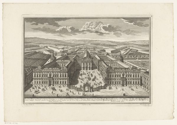 Editor: So, this is "Gezicht op de Grande Galerie van het Louvre," or "View of the Grande Galerie of the Louvre," an engraving by Jean Marot, dating back to the 1650s. I'm struck by the precision of the lines, creating a detailed architectural rendering. It's almost photographic in its clarity, despite being made so long ago. What stands out to you from a formal perspective? Curator: Indeed, the clarity arises from a very meticulous use of line, carefully delineating form and space. Note the emphasis on horizontality – how the receding lines of the building draw the eye deep into the picture plane, only to be checked by the verticality of the architectural structure itself. Consider how this tension constructs the pictorial space. How might you describe the way Marot uses light and shadow? Editor: It seems like light is being used functionally to describe shape, rather than to create any dramatic effect. The lines indicating shadow are uniform. So, is this less about depicting natural light, and more about diagramming the structure? Curator: Precisely. Notice how the even distribution of light flattens the space. There’s little chiaroscuro to suggest atmosphere or depth. This contributes to a sense of order and control, characteristic of architectural prints intended for documentation. It also subtly echoes classical ideals of harmony. Editor: So, it’s not just a picture, but a carefully constructed statement about order, made possible through engraving? Curator: Absolutely. The very medium of engraving, with its precise and deliberate lines, reinforces this message. Think about the way the architect views their drawings versus the building being constructed. It's an idealized vision. Editor: It's amazing how much you can unpack just by focusing on line, light, and structure. I would have completely missed that. Curator: Exactly. These visual choices define the work more profoundly than, perhaps, any symbolic content we might seek to impose. Always let the artwork inform your critical lens.