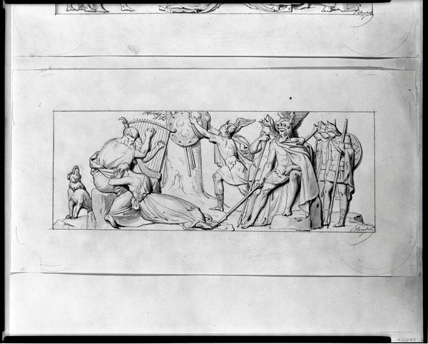 Curator: This is John Singer Sargent's "Two Figures, Study for Relief Over 'Music,' Museum of Fine Arts, Boston," a preparatory sketch residing at the Harvard Art Museums. Editor: It feels grand, even unfinished. The powerful figures strain upwards, giving an immediate impression of striving. Curator: Sargent was tasked with decorative paintings for the MFA, and this graphite study reveals his process. We see him grappling with form and composition, exploring the relationship between these figures and the architectural space. Editor: I wonder about these figures and the symbolism they held within the MFA's artistic vision. Considering the historical context, were these figures meant to represent a specific ideal, perhaps rooted in classical or even colonial narratives? Curator: Absolutely. Sargent's work, though celebrated, was not immune to the power dynamics and social ideologies of the time. Examining the figures' representation – their strength, their apparent lack of individuality – prompts us to consider the broader narratives they reinforce or challenge. Editor: This makes me consider how institutions shape not only artistic production but also the reception of art, reflecting existing power structures. Well, it's certainly provided a lot to think about. Curator: Indeed, an appreciation of the historical context is essential to interrogating the social framework in which art is created, exhibited, and interpreted.
