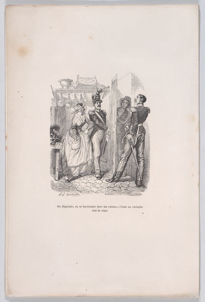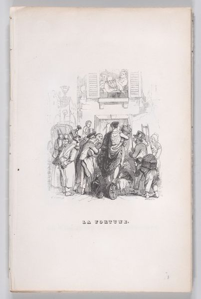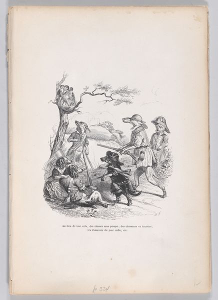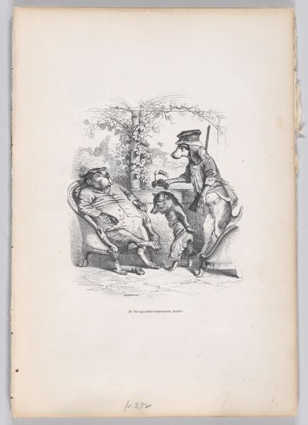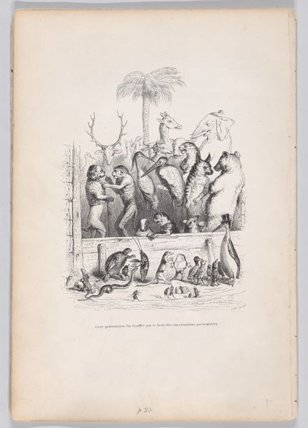 This lithograph, "The Beautiful World of the Tuileries" by J.J. Grandville, presents a whimsical scene rendered in intricate detail. The composition is structured around a gathering of anthropomorphic animals, each meticulously dressed and posed to mimic human society. The figures are arranged in a carefully constructed tableau, with variations in height and posture that create visual interest. The use of line is particularly striking, defining the textures of fur, feathers, and fabrics with precision. The monochrome palette further emphasizes the formal elements, allowing the viewer to focus on the shapes, patterns, and the overall structure of the composition. Grandville employs satire through his animal figures to destabilize human social norms. The semiotic system at play is clear: animals in human attire serve as signs, inviting us to decode the underlying structures of power and representation. The image prompts reflection on the arbitrary nature of social hierarchies and the performative aspects of identity. It is through this playful yet incisive formal arrangement that Grandville challenges fixed meanings and encourages ongoing interpretation.