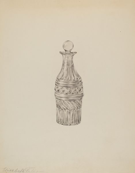 Curator: The way light glints off this glass is just exquisite! Editor: Indeed. We're looking at a drawing entitled "Glass Wine Decanter" by Erwin Schwabe, likely sketched around 1937. Notice the aged, toned paper – typical for a sketchbook of that era. It's all rendered in pencil, quite delicately. Curator: Delicately, yes, but with such confident strokes. You can practically feel the coolness of the glass and see the skilled labor needed to create a real glass version of this. Do you think this might be preparation for a manufactured object? Editor: Almost certainly. Considering the timing and the style, it aligns with the prevalent design aesthetic of the period – hinting towards mass-produced luxury items. Think about how interwar economic pressures may have shaped both the market for and the means of production of such decorative pieces. Curator: Exactly. We see it reproduced on paper, a readily available and affordable material but destined to be transferred onto what would hopefully become glass made for purchase and display. There is something really thought-provoking about that chain of processes, from concept to commodity, embedded in this image. Editor: I find myself contemplating its reception by the public. Wine decanters in that period often served a social function; part of a display of domestic comfort and maybe even subtle aspirational messaging. Did owning objects such as this suggest certain lifestyle aspirations? Curator: I think you’re spot-on. These aren't just vessels for wine; they are objects of art meant to communicate social status. Look closely and note the attention given to the decanter’s stopper in Schwabe's sketch. It's a very elegant rendering. The craftsmanship represented must have had great meaning. Editor: The sketch itself acts almost as propaganda for a lifestyle centered around refinement and social performance. It also prompts thinking around class, as only some would be able to have these objects in their homes. Curator: Well, looking at it this way really sheds a different light on such a commonplace image! It underscores just how many stories and values an object can come to carry. Editor: Precisely! It’s a reminder to appreciate the power dynamics subtly embedded within the everyday imagery that we often overlook.