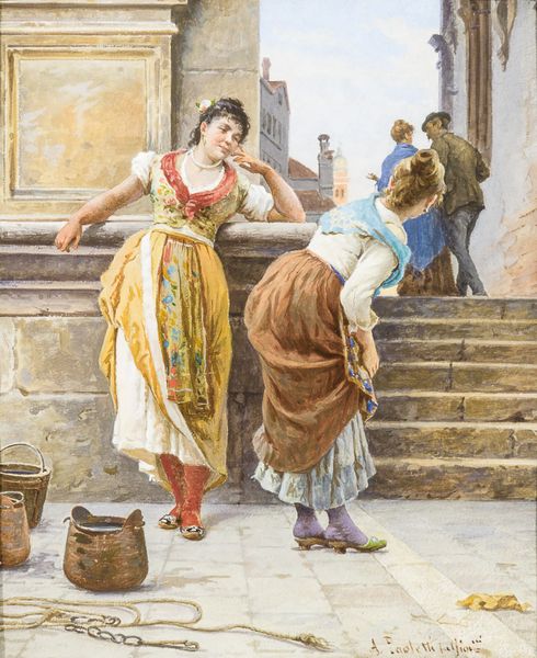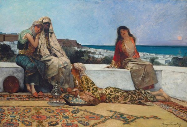 Editor: So, here we have "A Terrace in Morocco," painted by Jean-Joseph-Benjamin Constant around 1880. The shimmering light is captivating, and there’s almost a dreamlike quality to the figures on the terrace. What strikes you most when you look at it? Curator: I see an echo of shared cultural memory. Consider the symbols presented to the European gaze: the languid pose of the women, the oriental carpet, the suggestive presence of a servant seemingly guarding access. It all coalesces into a symbolic language about desire, control, and distance. Do you perceive any tension between how Morocco is portrayed versus how it presents itself? Editor: Well, it definitely seems filtered through a European lens. I wonder how much Constant truly understood about Moroccan culture or if he projected his own fantasies onto the scene. The composition also seems very staged, almost theatrical. Curator: Precisely! It's an exercise in the *theatrum mundi*, the world as a stage. The artist carefully constructs the image using readily available visual shorthands or prompts about the "Orient", the “other”. Even the use of vibrant colours contributes to this emotional language and reinforces prevalent assumptions and prejudices. What does the use of *plein air* here communicate about authenticity, whether accurate or otherwise? Editor: That's interesting. *Plein air* suggests spontaneity and immediacy, but the scene itself feels so contrived. It creates a conflicting message; perhaps Constant wished to evoke "authenticity", although from a detached point of view. Curator: The painting's potency resides in its carefully selected elements, symbols and references all steeped in meaning and readily legible by its contemporary viewers. Consider how persistent some of those symbolic meanings remain even today. Editor: This has made me rethink the layers of representation, and it gives "A Terrace in Morocco" more symbolic power than I originally considered. Curator: Yes, seeing isn’t only about observing the external reality; it is an exploration of internal narratives, individually, socially, and even politically, that endure over time.