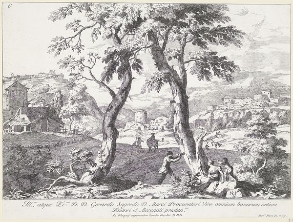 Curator: Let's discuss "Plate 4: landscape with man leading a pack horse across a wooden bridge, three figures in right foreground, the silhouette of a man standing at a fence beyond, from 'Landscapes'." Marco Ricci created this engraving sometime between 1723 and 1730. It’s currently held at the Metropolitan Museum of Art. What strikes you most about it? Editor: Immediately, I'm drawn to the serenity and subtle activity woven into this landscape. The contrast of the detailed foreground with the almost dreamlike rendering of the distant hills evokes a peaceful, yet observant quality. Curator: Absolutely. Ricci was working within a tradition of landscape prints designed to be both aesthetically pleasing and culturally informative. Prints like this were often collected as a form of "armchair tourism," allowing people to experience vistas they might never actually visit. This one shows an idealized view of rural life, which we might see as politically charged depending on how it contrasts to reality. Editor: The very ordinary elements—the man with the horse, the resting figures—placed in the composition call to mind issues of labor, land use, and the ever-present negotiation between humans and the environment. Are we looking at the fruits of exploitation or harmony? This can spark discussions about the role of art in reflecting—or shaping—perceptions of nature and society. Curator: The Baroque influence is evident in the dynamic composition and intricate details, but there’s a restraint, perhaps hinting at the shift toward more sober styles later in the 18th century. He carefully crafts this vision, which reminds us about what patrons desired during that era and why. The art market also shaped perceptions. Editor: Indeed. Reflecting on our engagement with landscapes as idyllic scenes and potential settings of class and power dynamics forces us to grapple with how we, today, internalize and project values of society and equity onto the environment. Curator: And perhaps reminds us how easily picturesque scenes obscure the complex social realities they present. Thank you for pointing to those deeper resonances. Editor: My pleasure. Seeing art this way helps to unveil layered truths.