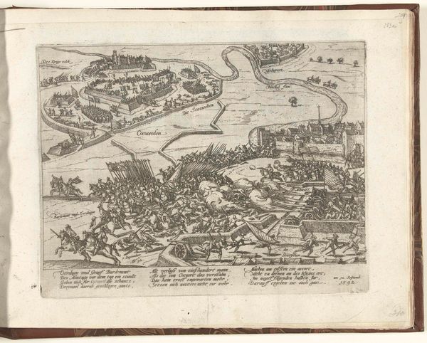Editor: This print, "Hendrik IV neemt La Fère in, 1596," by Philipp Uffenbach, rendered in etching and ink, presents a bird's-eye view of a battle. What strikes me is the almost map-like quality, yet teeming with so much implied action. How do you interpret this work, particularly in its historical context? Curator: Well, this isn't just a historical record; it’s a potent articulation of power. Think about who would commission and consume such an image. It's less about the gritty reality of warfare and more about solidifying Henri IV’s image as a triumphant, divinely sanctioned ruler. The ‘eye-in-the-sky’ perspective denies individual suffering, and amplifies a sense of control and dominion, obscuring the brutal realities of war. Do you see any elements within the composition that seem to reinforce this controlled narrative? Editor: I see that La Fère is centrally located, with all the action converging towards it. It’s as if the city is the prize, and the chaos of battle is secondary to that. Curator: Exactly! Consider also that Philipp Uffenbach was working within the visual language of the Baroque era. The emphasis on dynamic movement, dramatic composition – it’s all designed to evoke an emotional response. But what kind of emotional response is carefully being constructed? Fear? Awe? Or something else entirely? What about how this relates to contemporary issues of political representation in art? Editor: It seems designed to inspire confidence in the King. To quell any unrest by creating the impression of order and victory. Knowing it's an artwork gives us a layer of critical distance to reflect on that intent. Curator: Precisely! Recognizing the layered intentions of this print—as both a historical document and a political tool—lets us examine whose narratives are amplified and whose are erased. Ultimately it helps us become more conscious viewers in our own time. Editor: I now recognize that the artwork serves as a tool to shape perceptions of power and solidify authority in the eyes of its intended audience, which encourages further thought on political narratives presented through art. Thanks!