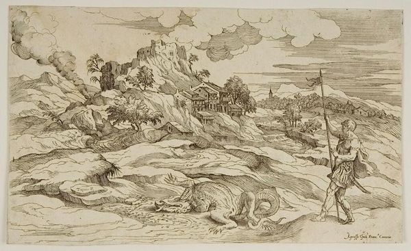 Editor: This is "Landscape with a Swineherd," an anonymous work housed at the Harvard Art Museums. The etching feels quite pastoral. What compositional elements strike you most? Curator: The contrasting textures are compelling. Note the jagged rocks juxtaposed with the soft, rounded forms of the swine. How does this tension contribute to the overall dynamism? Editor: I see that! The swineherd seems almost swallowed by the landscape. Curator: Precisely. The artist employs a complex network of lines to create depth. Consider how the density of line work varies across the composition, guiding the viewer's eye. What do you think of the atmospheric perspective? Editor: It's subtle, but definitely there, creating a sense of vastness. I hadn't noticed how the lines fade into the distance. Thank you. Curator: Indeed. A careful study of line and form reveals a sophisticated understanding of visual space.