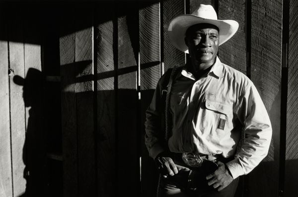 Editor: Here we have Mikki Ferrill's gelatin-silver print, "Chicago," created in 1973. There’s something so direct and honest in the subject's gaze. What statements about society or the world can be gathered from it? Curator: Looking at “Chicago,” I see a potent statement rooted in the Black Arts Movement. The direct gaze, the fedora, even the cigarette—they all coalesce into a portrait of defiance and self-determination. The subject asserts his presence in a world that often tries to erase or misrepresent Black identity. Editor: I can see that defiance. Were images like this meant to be confrontational, challenging the status quo? Curator: Absolutely. Consider the context. The 1970s saw Black artists actively reclaiming their narrative, pushing back against stereotypical portrayals. Photography, in particular, became a powerful tool. Editor: So, this is more than just a portrait; it’s a political act? Curator: Precisely. The choice of black and white photography lends a timeless quality, linking this individual to a broader historical struggle. The stark contrast emphasizes the subject’s features, forcing the viewer to confront his humanity. Do you see any particular symbolism within it? Editor: Maybe the hat and cigarette give off the impression of resilience, despite hardship? It’s like they're projecting, I’m still here despite everything. Curator: It's certainly an insightful perspective, it highlights how individual expression can become a form of social commentary. What I am sure of is this image really resonates as a document of a transformative period. It underlines the enduring power of art as a vehicle for social change. Editor: It’s incredible to think about the many layers within one image. I appreciate how it's making me see art in its cultural context, thanks.