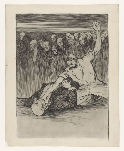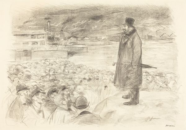 Jean-Louis Forain created this lithograph, "Staking van fabrieksarbeiders" which translates to "Strike of factory workers," offering a glimpse into the social upheavals of his time. Born in 1852, Forain lived through a period of intense industrialization and labor unrest in France. The print depicts a crowd of workers gathered before a factory, their faces a mix of hope and exhaustion. A figure stands atop what appears to be a rock, passionately gesturing towards the factory, his posture radiating defiance. It is hard not to notice the figures of women and children among the crowd, underscoring the widespread impact of labor struggles on families and communities. The artist captures the palpable tension between the working class and the industrial system. Forain, who was known for his unsentimental depictions of Parisian life, channels the raw emotion of the era, inviting us to reflect on issues of labor, class, and social justice. The print serves as a potent reminder of the human cost of industrial progress and the ongoing struggle for workers' rights.