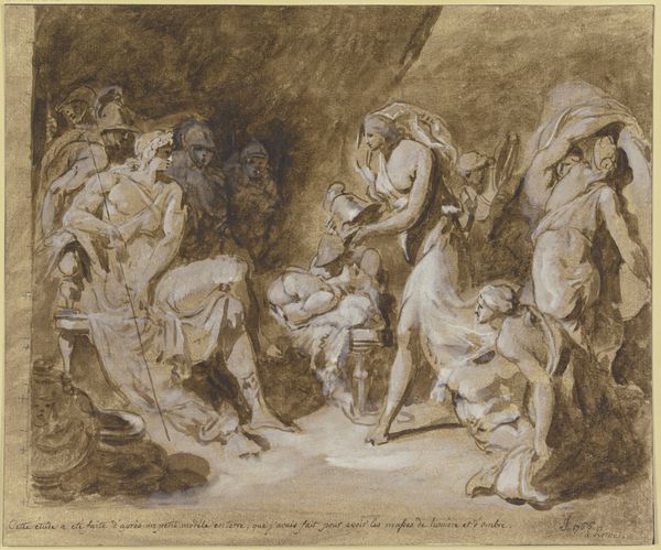 Philippe Louis Parizeau created this print called 'Ancient Sacrifice', using etching, a printmaking technique, on paper. The etched line is prominent here, clearly defining the figures and their emotional gestures. The print was made by coating a metal plate with a waxy, acid-resistant substance, and then scratching an image into that coating. When the plate is dipped in acid, the exposed lines are eaten away, creating grooves. Ink is then applied to the plate, and paper is pressed into it, transferring the image. The etched line lends itself to intricate detail, but also to mass production – a far cry from the unique, hand-worked qualities we associate with drawing or painting. Parizeau has embraced this duality, using the medium to convey both the drama of the sacrificial scene, and the cool remove of an image made for circulation. By understanding the methods and materials, we can grasp how this print bridges the gap between the fine arts and more commercial forms of image-making.