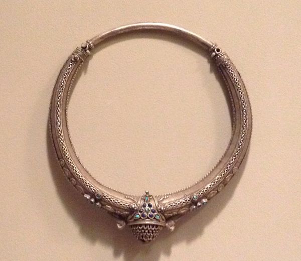 This torque, of unknown date and origin, is a striking piece of metalwork displayed at the Minneapolis Institute of Art. Its circular form, emphasized by ribbed textures and punctuated by a decorative sphere, evokes an immediate sense of enclosure and completeness. The choice of metal, with its cool, reflective surface, brings a tactile and visual weight to the piece. The circular structure, composed of segmented bands, creates a rhythm that draws the eye, yet the break in this pattern with the sphere introduces a point of focus and tension. Semiotically, the circle can represent continuity and wholeness, while the segmented pattern might signify a structured, perhaps hierarchical, societal framework. The sphere, adorned with intricate details, could symbolize individuality or importance within this framework. Ultimately, this torque functions as more than mere adornment; it is a structured object that communicates complex ideas about the relationship between the individual and society. Its ongoing interpretation leaves room to explore the relationship between aesthetics, cultural context, and evolving philosophies.