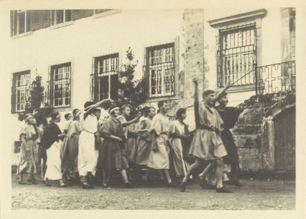 This photograph shows students from Schule Schloss Salem during a dramatic performance. It was made anonymously, and at some point in the twentieth century, probably, though I can't tell exactly when. Look at the composition; the students cluster in the foreground, their draped costumes a study in monochrome, like a classical frieze. The architecture looms in the background, a stark contrast to the soft textures of the clothing. It's not so much the 'what' but the 'how' that intrigues me here. I’m struck by the fact that the artist is unknown; it's somehow appropriate given the setting of this image. The high-contrast light flattens the scene, turning it into a pattern of light and shadow; it's so easy to imagine this as an abstract painting, with its subtle tonal shifts and carefully balanced forms. The whole thing feels so loaded with history, and with mystery. There is something unsettling about not knowing who made this. You can't really grasp it, can you? Which is perhaps the point...