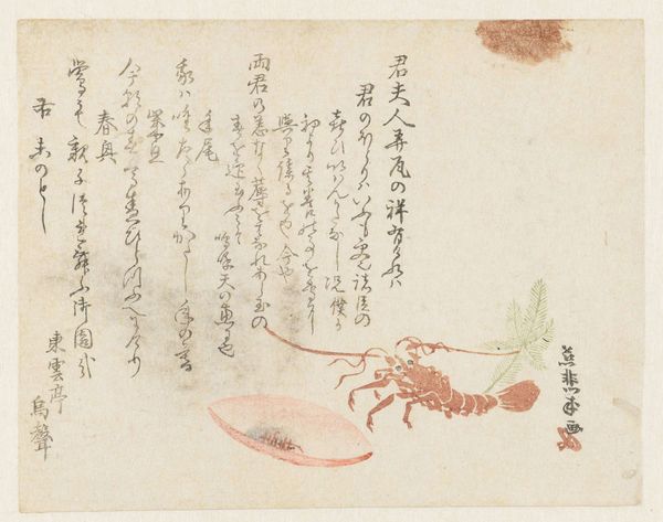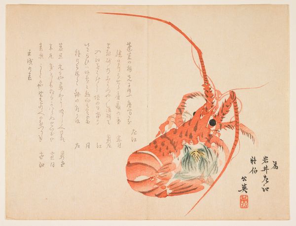 Editor: Here we have Ryūryūkyo Shinsai's "Shrimp and Cuttlefish," a watercolor print dating from 1750 to 1835. I find the composition really interesting – a large shrimp dominating the foreground, some faint plants, and a translucent shape floating at the top... Almost dreamlike! What can you tell us about this piece? Curator: Notice the labour inherent in this Ukiyo-e print. Multiple blocks, painstakingly carved, each representing a separate color. Consider the paper: Where was it sourced? How was it made? Look at the economic exchange at play – who was buying prints like this, and what did owning such an object represent? Was it about the beautiful aesthetic or social prestige and how does it allude to class structures. Editor: That's fascinating, thinking about the actual process! I hadn't considered that. So, instead of seeing it as just an image of a shrimp, it’s more about the consumption, labor and social structures of that time. Curator: Exactly. Even the subject matter. Seafood would have been readily available; a popular item at the market. Who had access to fresh shrimp? Think about the resources required to create these prints in the first place. Pigments derived from minerals and plants and animals…these materials had inherent value. Where does "high art" meet commodity here? How might our modern access change our interpretation? Editor: Wow. It completely changes how I see this print. Thinking about those carved blocks, the sourcing of materials, and its circulation gives it new depth, making it about a lot more than just food. I will definitely consider it through this lens moving forward. Curator: It’s these questions about production and exchange that make viewing artwork such an active, rather than passive experience. I see prints completely differently now myself, by having to explain all of this.