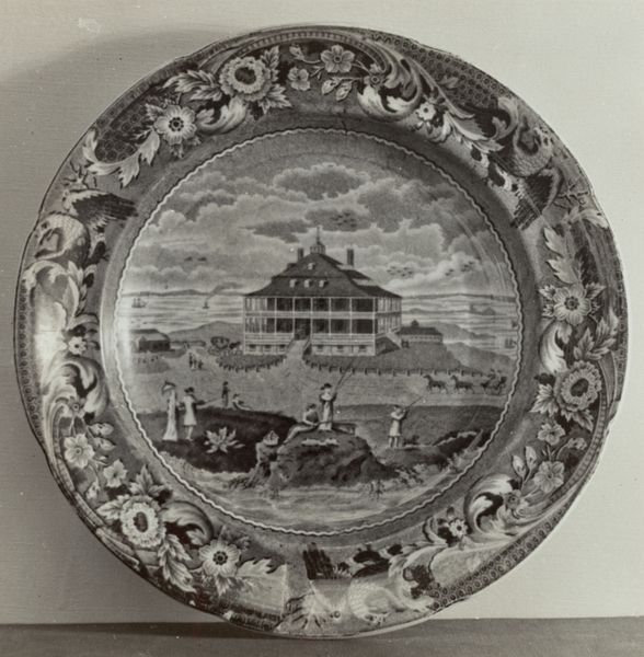 This striking plate, likely crafted in the late 19th century by Helmut Hiatt, captures a "Steamer, Union Line" within its decorative borders. During this time, industrialization fueled the growth of transportation networks, profoundly impacting American society. Consider the romanticism of the steamship, a symbol of progress, juxtaposed against the backdrop of complex social dynamics. Who had access to this progress? The figures on the shore, their class hinted at through their attire, gaze out at a vessel that might represent opportunity or perhaps, for some, exclusion. The ornate border of shells and foliage frames this scene, seemingly domesticating the power of the steam engine. The plate invites us to consider the intersection of industry, leisure, and representation. Think about whose stories are elevated and whose are marginalized in these seemingly simple, everyday objects. It serves as a reminder that even in our domestic spaces, we are surrounded by artifacts that perpetuate broader societal narratives.