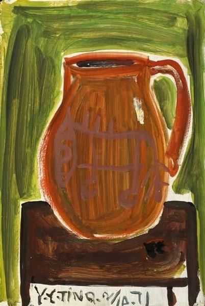Editor: Here we have Bela Czobel’s "Vase on the Chair", painted in 1917 using oil paints. The color palette creates a very warm, almost melancholic mood for me. What do you see in this piece? Curator: This artwork speaks volumes about the cultural and political anxieties simmering beneath the surface of early 20th-century Europe. The seemingly simple still life, rendered in such earthy tones, presents itself as deceptively domestic. But look at the brushstrokes, the slightly distorted perspective – does that suggest stability, or rather a world on the verge of collapse? Considering Czobel’s Hungarian Jewish identity in a period marked by rising antisemitism and nationalistic fervor, one can’t help but read the tilted vase as symbolic of precarity and displacement. What do you make of the objects seemingly discarded? Editor: That is not something I immediately thought about, but I see what you mean. Do you think it would have been read similarly during his time, or is this more of a contemporary perspective? Curator: While contemporary eyes are perhaps more attuned to intersectional analyses, anxieties about identity, displacement, and the looming threat of war were definitely part of the zeitgeist. Expressionism itself was, after all, a revolt against traditional representational forms, a way for artists to visualize inner turmoil and societal anxieties. So I'd argue that while our lens may be different, the core issues were very much present and palpable then, both to the artist and the viewer. It shows you what you knew but had no way of putting to word. Editor: I see; that is really thought-provoking and makes me see so much more in the piece now. Curator: It's all about considering art as a product of its time, constantly renegotiating meanings across historical and social contexts!