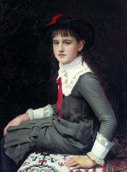 Curator: The artwork we're looking at is "Femme Au Chapeau De Paille." This oil painting is attributed to Alfred Stevens. It offers a captivating depiction of a woman. Editor: She has this melancholic, daydreamy vibe, doesn't she? I see subtle strength. The way the light catches the straw of that hat... it’s a bit theatrical, almost as if she is backstage preparing for a debut. Curator: It is interesting you say "theatrical." Alfred Stevens indeed placed women in settings that reflected social and cultural performances. A portrait such as this presents its subject within the theatre of high society, while alluding to the performative role of the 19th-century bourgeois woman. Editor: Performance, yes, spot on! That explains the costume feel of the green jacket and bright shawl! There’s this sense of contained energy, almost a hint of playful defiance lurking beneath her placid gaze. I’d love to paint her fingernails fire-engine red and see what she does next! Curator: The interesting detail is how Stevens merges portraiture and genre painting; he explores her persona through symbolic objects while the technique mirrors the values of impressionism. His choice of clothing communicates meaning. Editor: Oh! A statement through fabrics. I hadn't focused on the textures. The contrast of the loosely painted background with those intricately detailed pearl earrings... Beautiful tension! Curator: Certainly, we observe an understanding of form typical of the academy mixed with the atmospheric interest we expect to see with the Impressionists of his day. These paintings gained in popularity among collectors who were increasingly valuing paintings of modern bourgeois life. Editor: Well, I'm smitten by her ambiguity. I get the sense that she will slip that persona anytime now to grab her favorite snack. Her secret is safe with me, although my advice is... eat dessert first. Curator: I appreciate you highlighting her ambiguity. Hopefully our reflection gives people a richer engagement with its artistic choices.