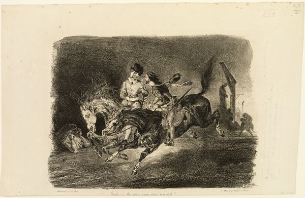 Curator: Here we have Reinier Craeyvanger’s "Uitrijdende wagen met boeren," which translates to "Outgoing wagon with farmers," created as an etching in 1834 and now residing here at the Rijksmuseum. Editor: My initial impression? It’s bursting with narrative energy despite the limited tonal range of the print. The diagonal pull of the horses and wagon creates dynamic movement right off the page. Curator: Indeed. Note how Craeyvanger captures a specific moment—the transition from stillness to action. The farmers within, along with the excited dog, anticipate departure, reflecting agrarian life and transit. Etchings like this democratized art; making genre scenes accessible to broader audiences beyond the elite who commissioned painted works. Editor: Precisely. Consider the artist's process. The fine lines and cross-hatching used to create tone, must have been carefully plotted, in terms of mark-making creating not just depth, but texture and light with the starkest of contrast to convey depth. It also highlights how the central, brighter horses become a focal point with those choices of tone and dark. Curator: The wagon itself speaks volumes, suggesting communal activity, and possibly even a journey towards market, which creates implied commentary about a community dynamic in trade relations of this era. I feel that it suggests their social connection to commerce in Dutch society, that feels like a through-line still today. Editor: But consider too, that visual hierarchy—the dominance of the horses in the composition suggests their essential role. Even how one horse is facing back to the structure seems as if hesitant for travel. This could even act as commentary on change or a time of transit from traditional living to perhaps life with trading at market as the central point of the work. Curator: The realism captures the era faithfully but could imply transition during those times in history and change as an emotional underpinning to the image itself. It's quite compelling and layered work, after further investigation and dialog. Editor: It makes me want to delve deeper into other prints made during the rise of industry. Craeyvanger’s composition pushes the limits for symbolic meaning. The etching feels more and more substantial.