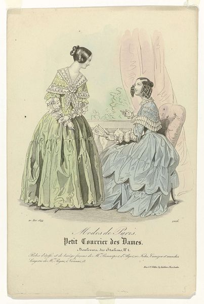 Editor: This is "Le Follet Courrier des Salons" from 1835, a print with watercolor attributed to an anonymous artist. It depicts two women in elaborate gowns. I’m struck by the almost performative nature of their elegance. It feels staged. What captures your attention when you look at this piece? Curator: Oh, it's absolutely staged, in the best possible way! For me, it’s a snapshot into a very specific world, a curated reality. Imagine, if you will, the rustle of taffeta, the scent of lavender, the unspoken language of posture. Look closely at the details: the crisp lines of the print, then softened by watercolor... Doesn't it whisper secrets of longing and desire? Editor: Longing? I hadn't thought about it that way. I was more focused on the fashion aspect. Curator: But isn't fashion all about aspiration? That feathered hat isn't just a hat; it's a statement! Perhaps a prayer for a grand romance, a clever bit of strategy to win in the game of high society. Don’t you feel a certain sense of yearning in the precise tilt of their heads, in the meticulous detail given to their finery? Editor: I suppose I see it now, the… intentionality of it all. It makes me wonder what their lives were truly like behind these fashionable facades. Curator: Precisely! And that's where the magic lies, isn't it? We look, we wonder, we weave our own stories into theirs. It’s a little window into another world, full of secrets and silent dramas. A reminder that beneath the surface, human emotions simmer, even amidst the fanciest of salons. Editor: I see so many little details I missed at first glance! This definitely gives me a lot to consider. Curator: And isn't that what art is all about? It holds a mirror up to life, even when life is wearing a very fancy hat.