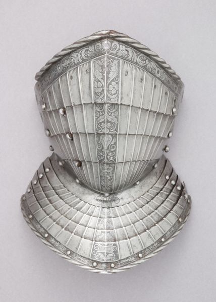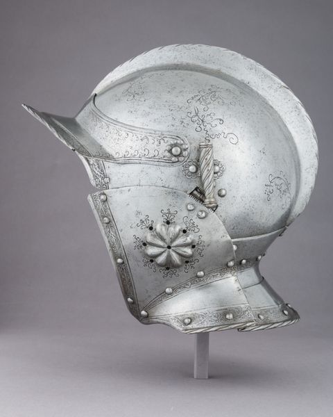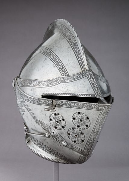 Curator: Just look at this marvel—a close helmet made for tourney combat, dating all the way back to 1552. It’s currently housed in the Metropolitan Museum of Art. Just imagining the clash of steel that this piece once witnessed! Editor: It’s austere and imposing. More like a polished skull than something offering actual protection, to be honest. All those tiny ventilation holes make me feel a little claustrophobic just looking at them. Curator: Claustrophobia aside, it embodies a pivotal moment in history where artistry and warfare converged. Metalworking, then, became a form of artistic expression. The helmet's creation is credited to Daniel Hopfer. Editor: Absolutely. I think pieces like this challenge the traditional art-historical narrative that often overlooks functional objects, or considers art and craft separately. I mean, how much artistic labor and conceptual thinking must have gone into this piece? Curator: A good point! Notice, though, how much refined ornamental etching and precision tooling went into the making. I find myself dreaming about the anonymous craftsman hammering away, meticulously crafting each curve and contour with focused intention. You can sense that he labored lovingly over his materials. Editor: I find myself thinking more about the elite identity performed by such armor. How wearing such pieces functioned as symbolic displays of class, gender, and military power. Curator: True, there is much that we can unpack around privilege in the tournaments—I agree. At its most basic, however, one is always seeking safety in battle. In a violent society, sometimes a person just needed to cover their head! Editor: It’s also about control over your image, or a type of masking of personhood—it's not always about individual safety, but creating public images around invulnerability. I suspect these elite men and women wanted the population to assume things about their power through wearing that equipment. Curator: You're right to nudge me on what constitutes "basic" or even "safety," particularly given whose security this helmet sought to ensure, and at what cost to others. That it has been around this long, what, over five hundred years? What would its maker have thought of us seeing it now? Editor: Right! Like who are the gatekeepers that determine what’s worth remembering or preserving? Thanks for sharing the space to consider these tensions.