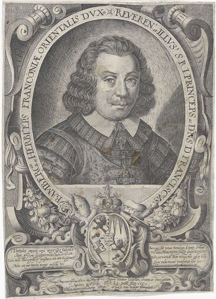 This is an engraving of Ernst Casimir, Count of Nassau-Dietz, created by an anonymous artist. The composition centers on the count's portrait, framed by an oval cartouche, which itself is set within a rectangular border adorned with symbolic elements. Notice how the contrasting textures—from the smooth face to the intricately detailed ruff and armor—create a tactile richness. The artist uses line and form to construct a visual hierarchy. The oval shape softens the rigidity of the square frame, drawing our eye to the central figure. Consider how these formal choices might reflect the cultural values of the time, where the display of status and power was often conveyed through structured and symbolic visual language. The surrounding emblems are not merely decorative but function semiotically, communicating aspects of the Count’s identity and authority. The very act of framing—of containing and presenting an image—engages with the philosophical problem of representation. The artwork acts not just as a likeness but as a complex signifier within its historical context.