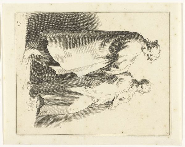 Curator: This drawing presents us with a rather intimate scene. Johan Philip Koelman created this “Double Portrait of an Old and Young Woman” in 1885, using a detailed pencil technique. Editor: It's instantly striking. The contrast between the two women—youthful beauty beside weathered age— evokes a poignant reflection on time and mortality. There's a real gravity to their shared space. Curator: Absolutely. Koelman positions the younger woman slightly forward, perhaps symbolizing her active presence in the world, while the elder sits more passively, suggesting wisdom accumulated through years. Editor: The younger woman's adornments feel particularly telling—her decorative clothing almost proclaiming a connection to past traditions, and yet holding those very hands of time that seem to diminish it. Almost as if to reassure the older woman. Curator: That detail ties into the tradition of portraying women, linking beauty to societal expectations. The shawls on their heads could signify modesty, but their varying conditions also imply generational shifts in values and appearances. The artist subtly uses costume and age as signifiers of status and cultural memory. Editor: Yes, and there’s something almost unsettling in their hands joined as well. One gets a very sentimental reading about motherhood but there could also be subtle critique about aging's loss of control. This makes you think about the changing public expectations about a women's place at the turn of the century, how this tension plays out. Curator: Precisely, the way the women hold hands in front, may also imply dependency between generations—echoing societal structures prevalent during that era. This reinforces your reading as Koelman might be inviting his viewers to examine power dynamics. Editor: So, what initially reads like simple portraiture actually hides so much about 19th-century gender expectations, or perhaps how society frames aging women versus youthful women and women of means in particular? A seemingly simple snapshot speaks volumes. Curator: And highlights our ongoing relationship with those themes and the way artists capture generational narratives. Editor: Indeed, this artwork is another invitation to connect art and social history—something very significant and poignant from only the details held in the subjects' clasped hands.