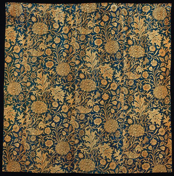 Curator: Welcome. Before us hangs a "Panel" woven sometime between 1860 and 1880, likely in France, by the firm Mathevon et Bouvard. Editor: It’s… undeniably ornamental. The symmetry and gold are eye-catching, almost dizzying in their opulence. A piece for decorative flourish, wouldn't you agree? Curator: Absolutely. We can examine the Arts and Crafts Movement influence here. Look at how weaving, as a 'lesser' craft, is elevated. It’s a deliberate challenge to the hierarchy of artistic production. The materials themselves—the very act of creating fabric—becomes central to its value. Editor: Interesting point. However, I am compelled by its symmetrical layout; observe how the design motifs are elegantly repeated. The interplay between the metallic gold and silver-grey ground creates a stunning contrast and hierarchy within its construction. Note the balance between the floral and abstract forms. Curator: I am curious to see where these panels were woven. Knowing the working conditions, the lives of the weavers themselves, is essential. Were these workshops organized around certain ideas of labor and craft, such as utopian communities? Who consumed the work? Editor: Fair questions to contextualize production and value. But isn’t the pattern, with its inherent visual vocabulary, communicating something on its own? Do the blossoms, arranged symmetrically, evoke feelings of abundance or luxury that we might further explore through design? Curator: Surely it is a commercial piece that aimed at bourgeois consumers. So perhaps it says more about the aspirations and the shallow values of that group rather than conveying some kind of elevated universal experience. I think such decorative fabric can say much about class and taste during that time. Editor: Well, the craftsmanship alone merits some appreciation outside just its economic placement. The artisans managed to forge, weave and fabricate this rich layered effect that cannot be entirely stripped of meaning, in its formal achievement. Curator: A beautiful thing, for sure. But to truly understand this “Panel,” we need to look at the larger context of its making. Editor: I see it somewhat differently. While I cannot neglect these societal and historical considerations, to see with clarity this aesthetic work must have attention turned primarily towards internal coherence and effect.